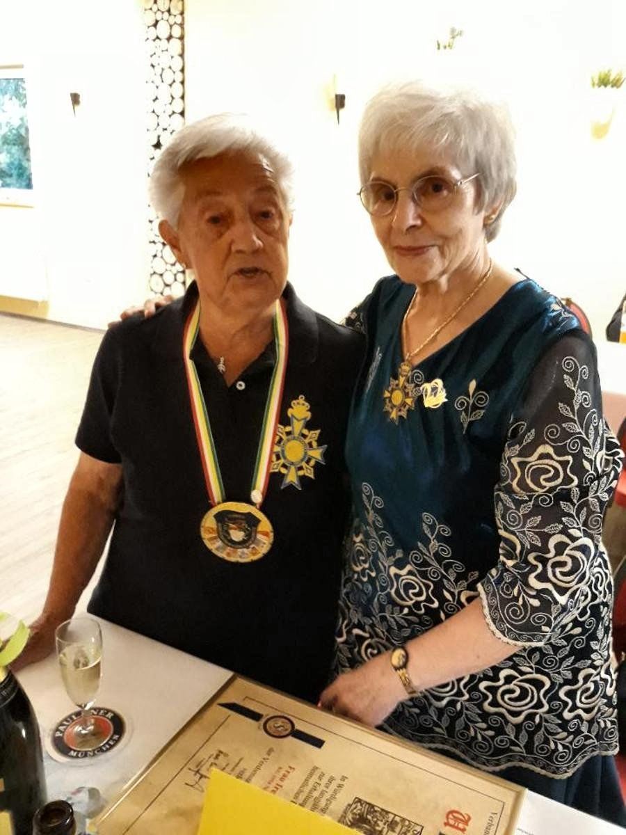 Danach holte der Koordinator Usula Balzer auf die „Bühne“ um ihr die Ehrenbrosche zum Jubiläum anzuheften. Besonders zu erwähnen ist hier, daß Uschi, genau wie ihr damaliger Prinz Manfred Neu, über all die Jahre den Kontakt zum Club aufrecht erhalten haben, auch wenn ihnen die Teilnahme an Treffen aus gesundheitlichen Gründen nicht möglich war.