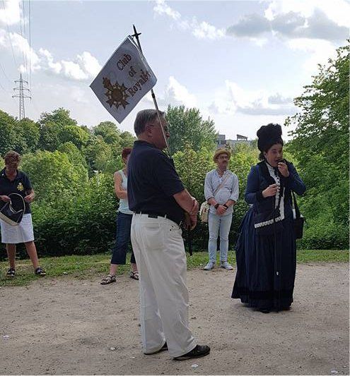 Beim diesjährigen Maitreffen haben wir uns, wie sich das für einen royalen Club gehört, von einer leibhaftigen Freifrau geleiten lassen. Es war Ida von Stumm-Halberg, die uns in der Person von Frau Rosa Wehlitz über das ehemalige Hüttenareal des Neunkircher Stahlwerks führte. Schwerpunkt war bei dieser Führung nicht die Stahlgewinnung, sondern das Leben als Gattin des Hütten-Barons Karl-Ferdinand von Stumm-Halberg in Neunkirchen. So suchten wir bei strahlendem(!!!) Sonnenschein diverse Plätze, Bauten und Denkmäler auf, die mehr oder weniger mit dem privaten Leben des Stahlbarons und seiner Familie verbunden waren. Selbst unsere betagtesten Mitglieder, VSK-Ehrenpräsident Horst Wagner und Irene, Prinzessin von 1954 und ich natürlich, ließen sich von der knalligen Hitze nicht beeindrucken!