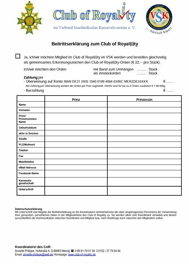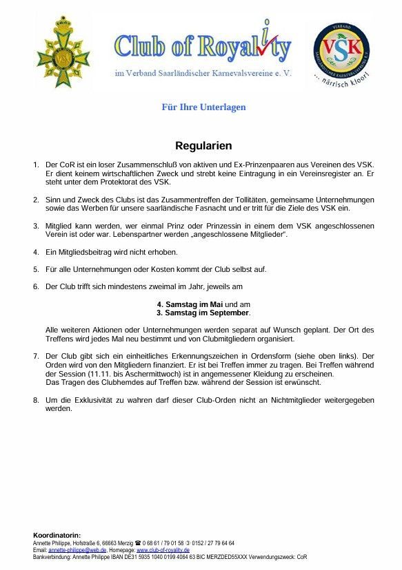 Willst Du Mitglied in unserem Tollitätenclub werden? Dann lies Dir bitte die nachstehenden Regularien durch! Wenn Du damit einverstanden bist, dann ist der nächste Schritt das Ausfüllen und Einreichen der Beitrittserklärung. Fordere das Formular bei mir, der Koordinatorin an. Die Adressen und Telefonnummern findest Du